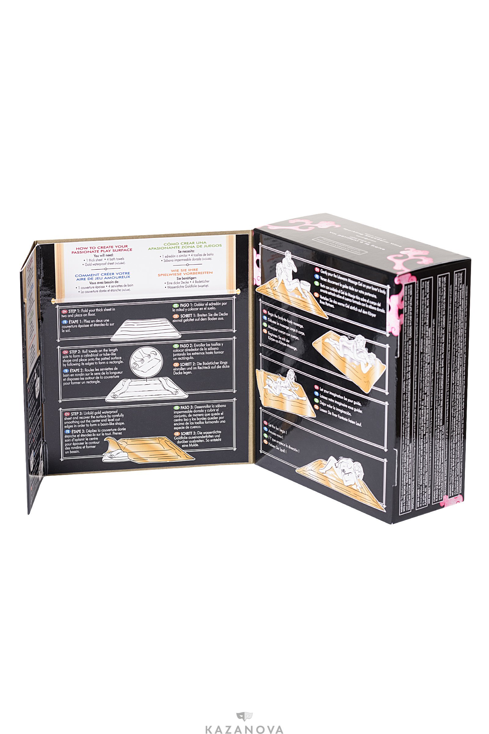 В комплект входят два флакона с возбуждающим гелем и воздухонепроницаемое покрывало. Гель съедобен.