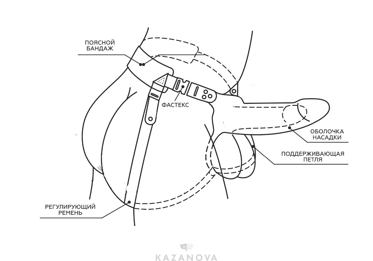 Страпон фиксируется на теле при помощи специальной системы ремней, подстраивающихся под индивидуальные параметры.