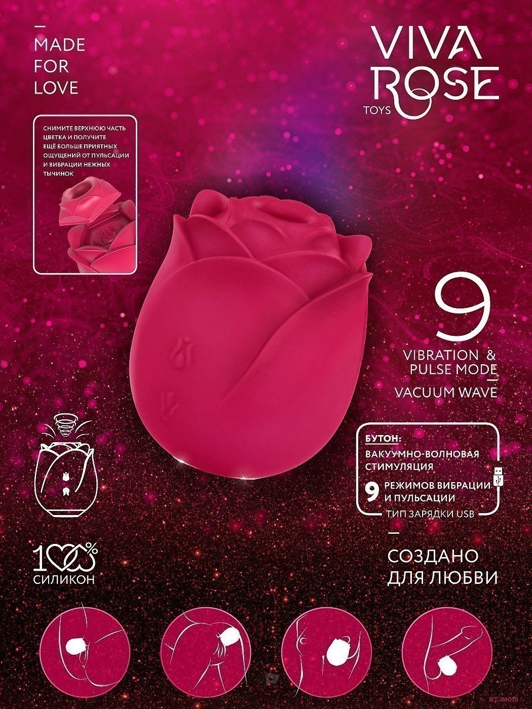 Вибростимулятор вакуумно-волновой Viva Rose в форме розы 9 режимов бордовый
